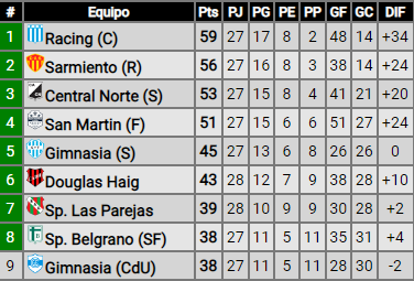 Racing aprovechó su oportunidad de volver a la cima, sabiendo que Sarmiento (R) no tenía posibilidad de sumar esta fecha por tener libre. En este momento la tabla se encuentra así: