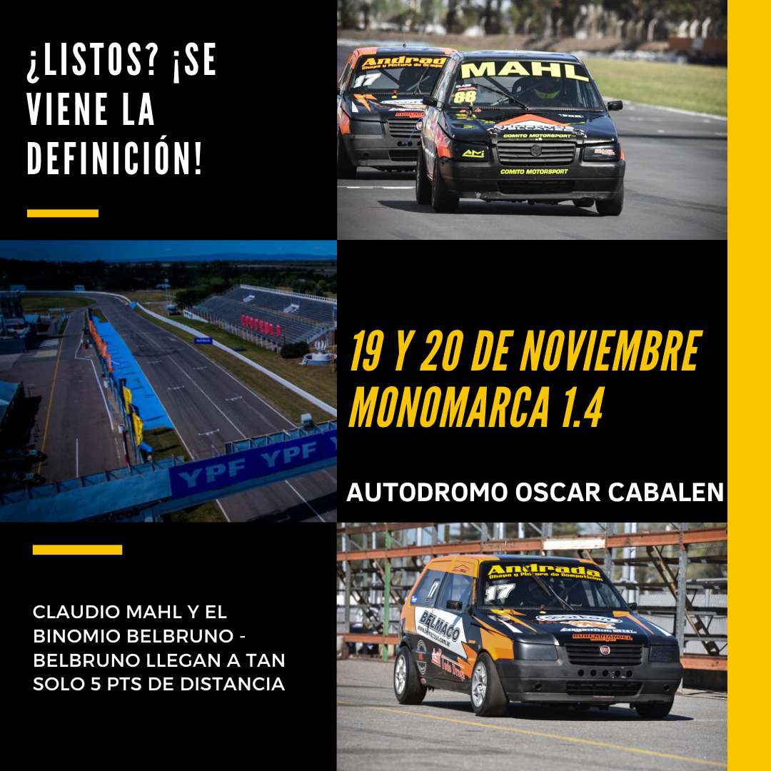 Este fin de semana se viene la definición de la primera temporada de la monomarca 1.4 que tiene como principales aspirantes al título a Claudio Mahl y al binomio Belbruno – Belbruno.