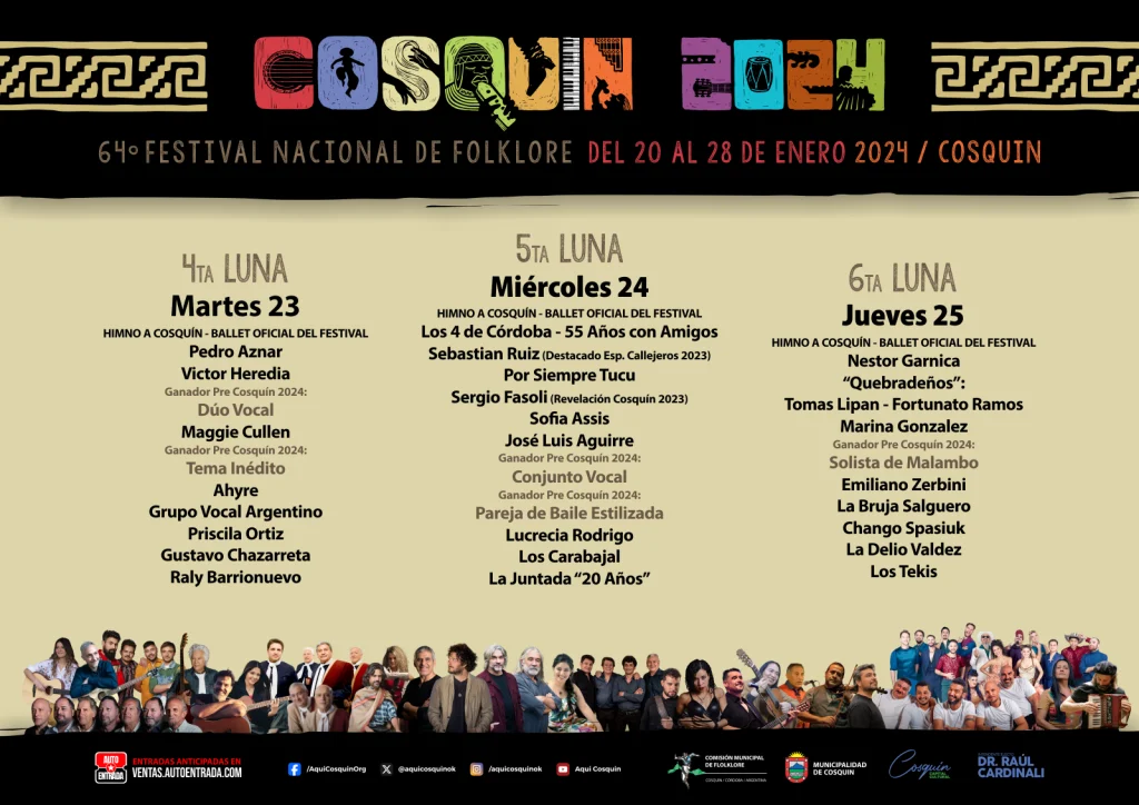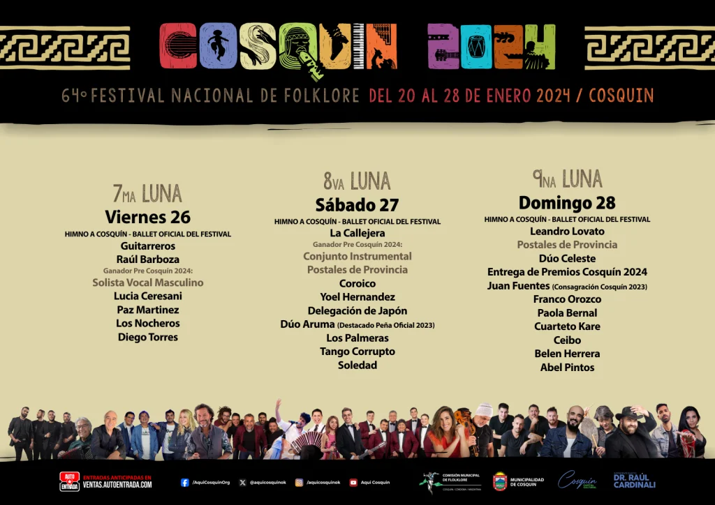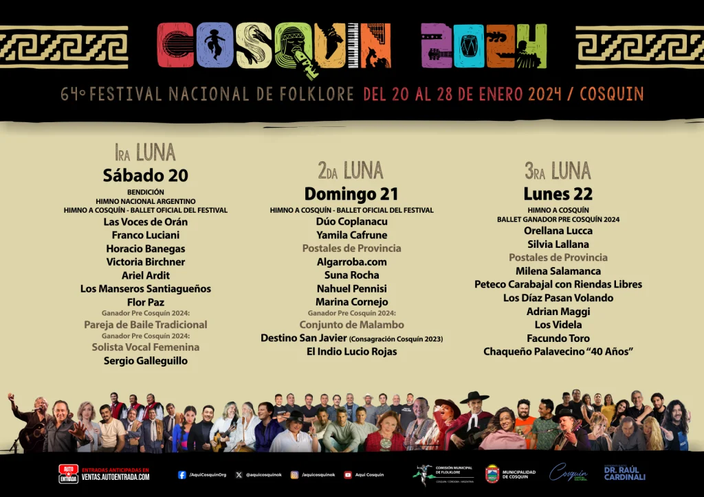 La edición 64° se llevará a cabo desde el sábado 20 al domingo 28 de enero 2024 en la emblemática Plaza Próspero Molina. Aunque todavía no se dieron a conocer los precios de las entradas, si se sabe que en la primer semana de diciembre se pondrán a la venta, en el sitio oficial del festival, y en diferentes puntos de ventas.