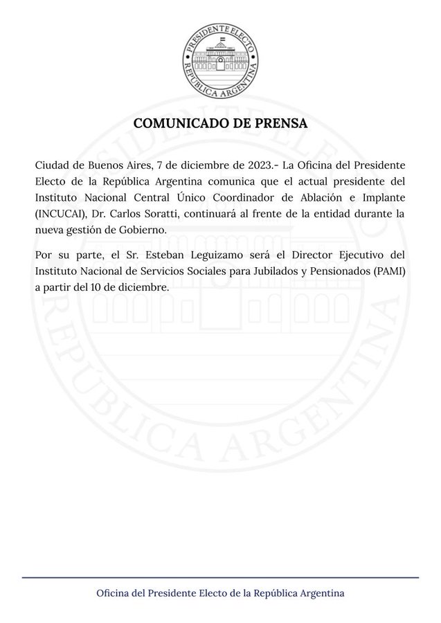 La Oficina del Presidente Electo anunció por X que Esteban Leguizamo estará a cargo de PAMI.