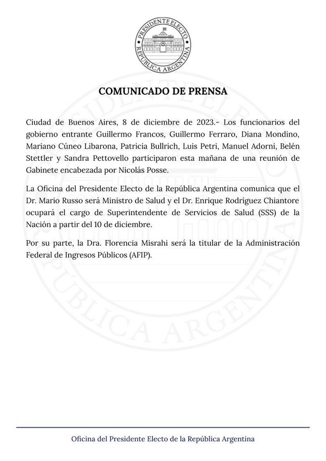 El Presidente electo, Javier Milei, confirmó este viernes a través de la Oficina del Presidente Electo en X a Mario Russo como ministro de Salud y Enrique Rodríguez Chiantore, quien estará a cargo de la Superintendencia de Servicios de Salud.