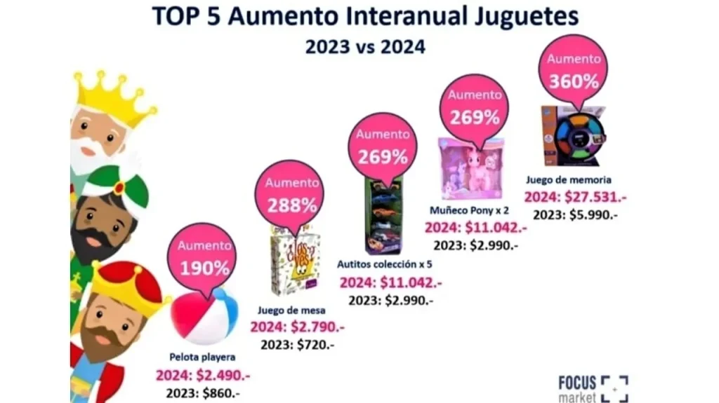 La consultora Focus Market dijo que los juguetes que más demanda tienen son: Juguetes 29%, Indumentaria 16%, Artículos Deportivos 11%, Calzados 9%, Videojuegos y consolas 8%, Libros didácticos 8%, Artículos de computación 7%, Telefonía celular 5%, Golosinas 5%, y Peluquería infantil 2%. Pero tienen tal incremento que algunos se hacen imposible para el público en general.
