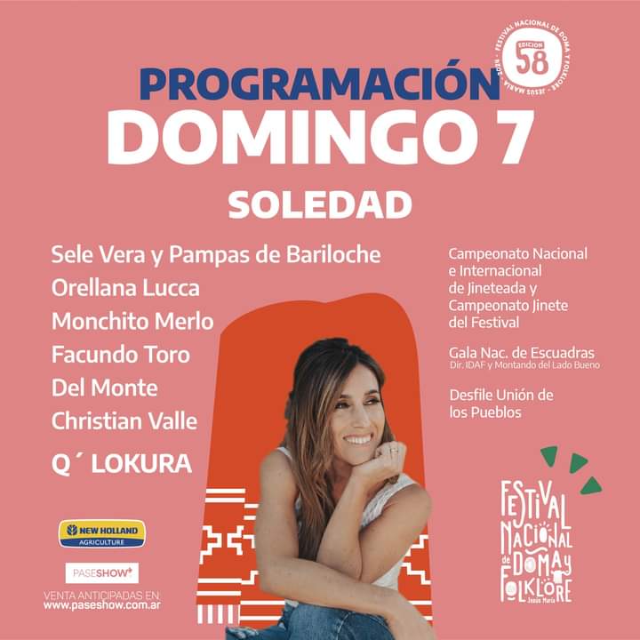 Se cierra el primer finde semana del festival a puro poncho al viento. Pisaran el escenario Martin fierro: Facundo Toro, Orellana Lucca, Sele Vera, Christian Valle y una de las artistas con mayor presencia SOLEDAD PASTORUTTI.