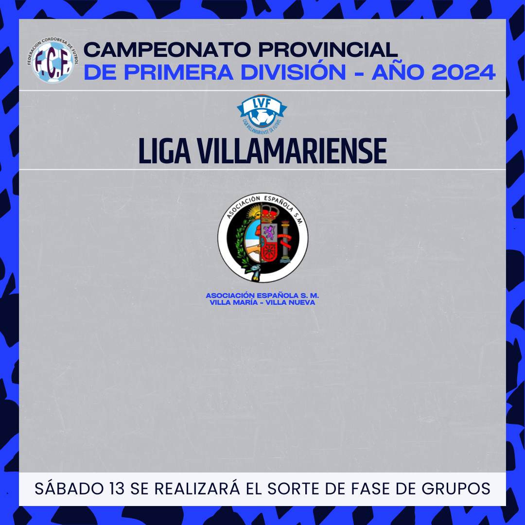 En esta edicion del Torneo Provincial de Primera Division 2024 participarán 44 clubes. Asociacion Española es el unico representante de la Liga Villamariense de Fútbol.