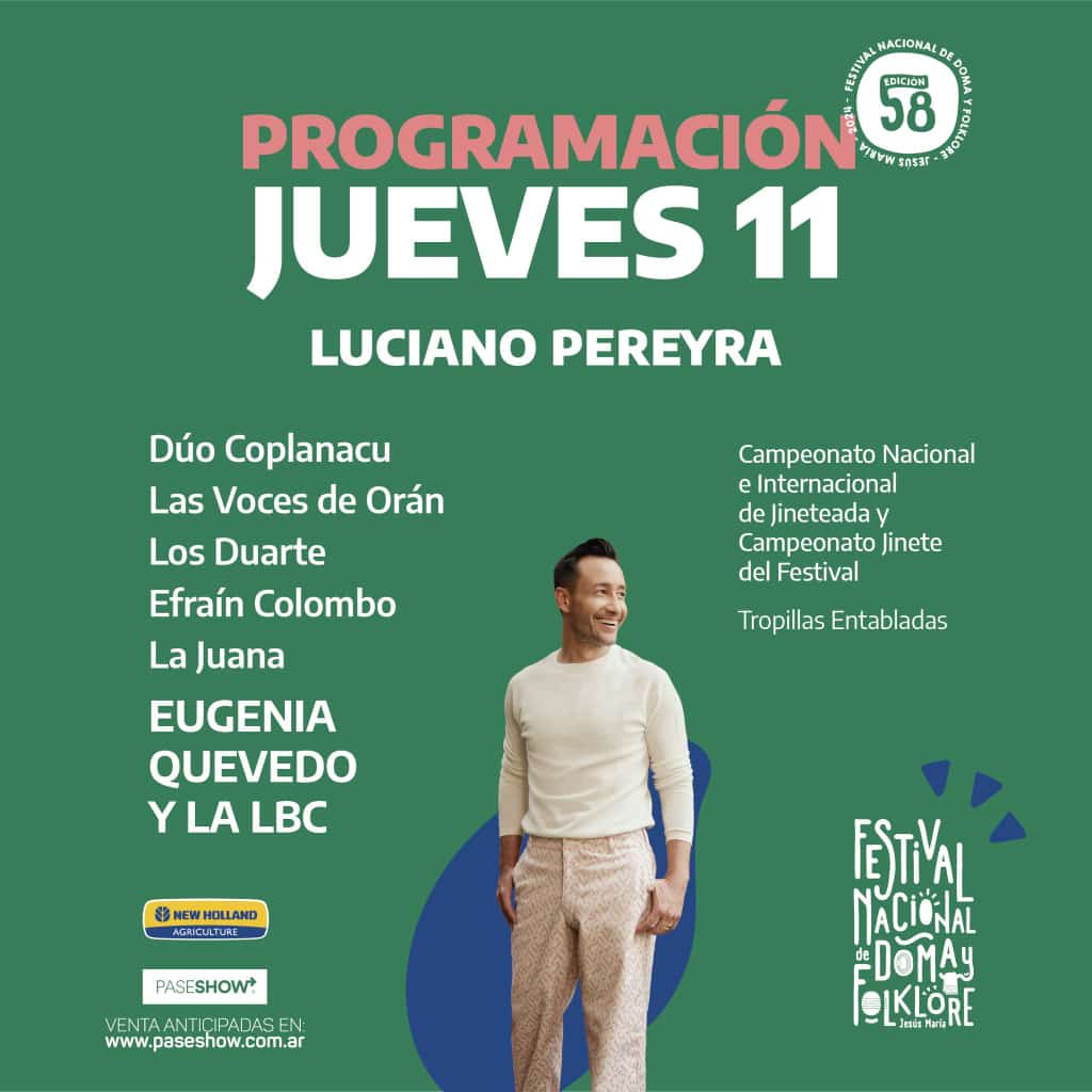 El artista más importante sin dudas será LUCIANO PEREYRA quien ya es figura destacada en el festival, y con sus fusiones que adquirió últimamente hará pasar a todo el público por todos los sentimientos.