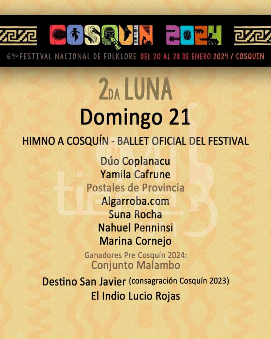 El segundo día en la Plaza Prospero Molina actuarán : Dúo coplanacu, Yamila Cafrune, Algarroba, Suna Rocha, Nahuel Pennisi, Marina Cornejo, Conjunto de Malambo (Ganadores del pre-cosquin), Destino San Javier y El Indio Lucio Rojas.