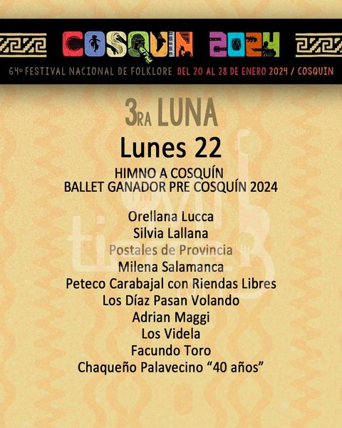 El día de hoy, actuarán en la Plaza Prospero Molina: Orellana Lucca, Silvia Lallana, Milena Salamanca, Peteco Carabajal con Riendas Libres, Los Díaz Pasan Volando, Adrian Maggi, Los Videla, Facundo Toro, Chaqueño Palavecino “40 años”.