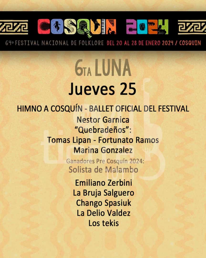 En el día de hoy se presentarán en la Plaza Prospero Molina: Nestor Garnica, Tomas Lipan, Fortunato Ramos, Marina Gonzalez, Emiliano Zerbini, La Bruja Salguero, Chango Spasiuk, La Delio Valdez y Los Tekis.