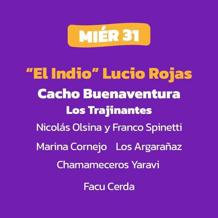 Hoy estarán tocando: El Indio Lucio Rojas, Cacho Buenaventura, Los Trajinantes, Nicolas Olsina y Franco Spinetti, Marina Cornejo, Los Argarañaz, Chamameceros Yaravi y Facu Cerda.