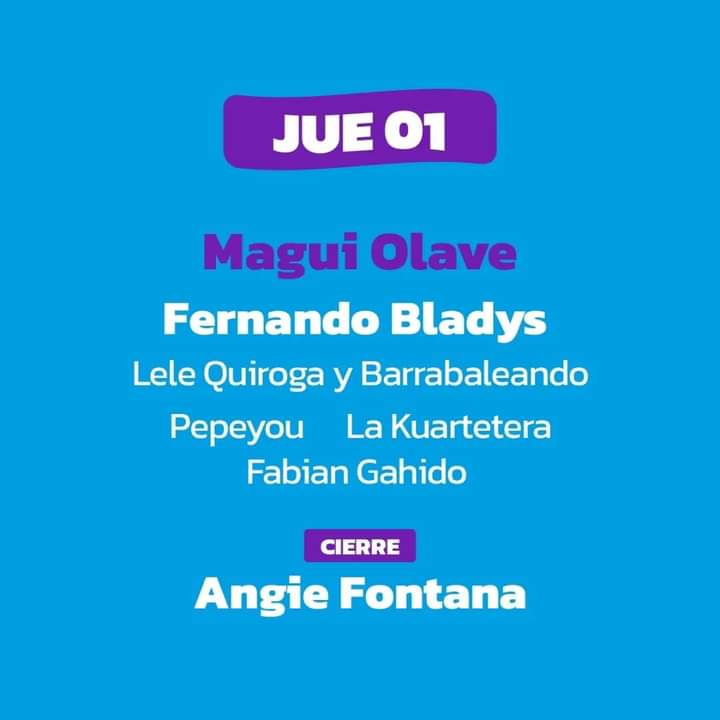 El día de hoy se estarán presentando los siguientes artistas: Magui Olave, Fernando Bladys, Lele Quiroga y Barrabaleando, Pepeyou, La Kuartetera, Fabian Gahido y Angue Fontana.