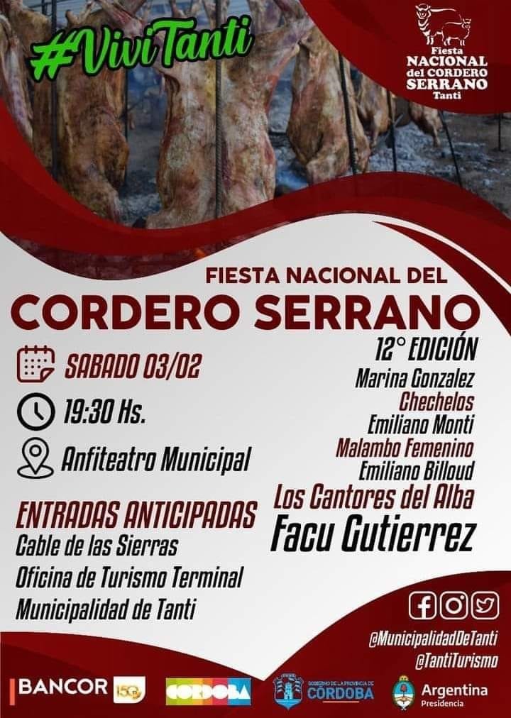 La Fiesta del Cordero Serrano realiza su décimo segunda edición, el cuál será el día de hoy desde las 19:30 hs. en el anfiteatro municipal Solar de Piedra de Tanti.