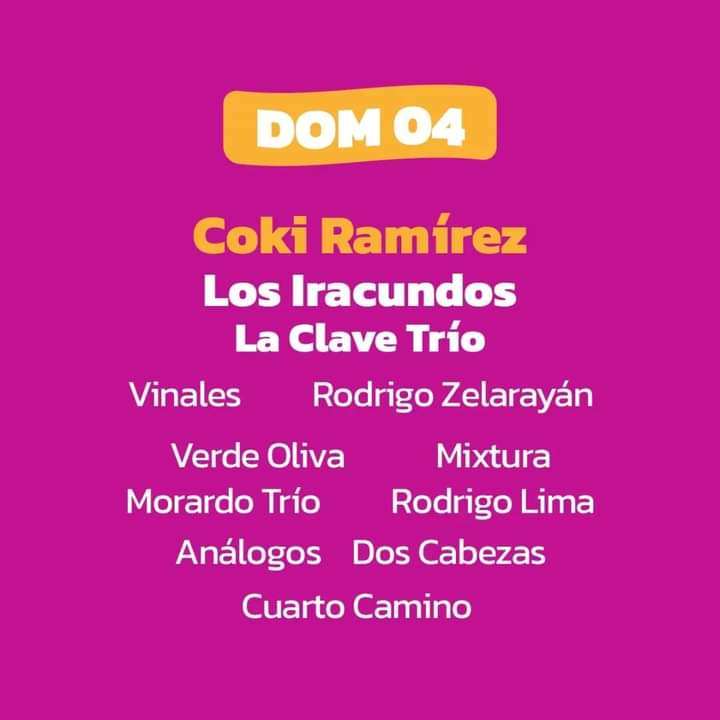 El día de hoy se estarán presentando los siguientes artistas: Coki Ramírez, Los Iracundos, La Clave Trío, Vinales, Rodrigo Zelarayán, Verde Oliva, Mixtura, Morado Trío, Rodrigo Lima, Análogos, Dos Cabezas, Cuarto Camino.