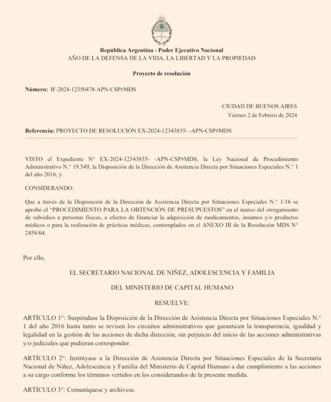 El viernes 2 de febrero, en el Boletín oficial, se informó que el Secretario de la Niñez, adolescencia y familia resolvió: Suspender la entrega de medicamentos a Ancianos, adultos, enfermos de VIH y cáncer.