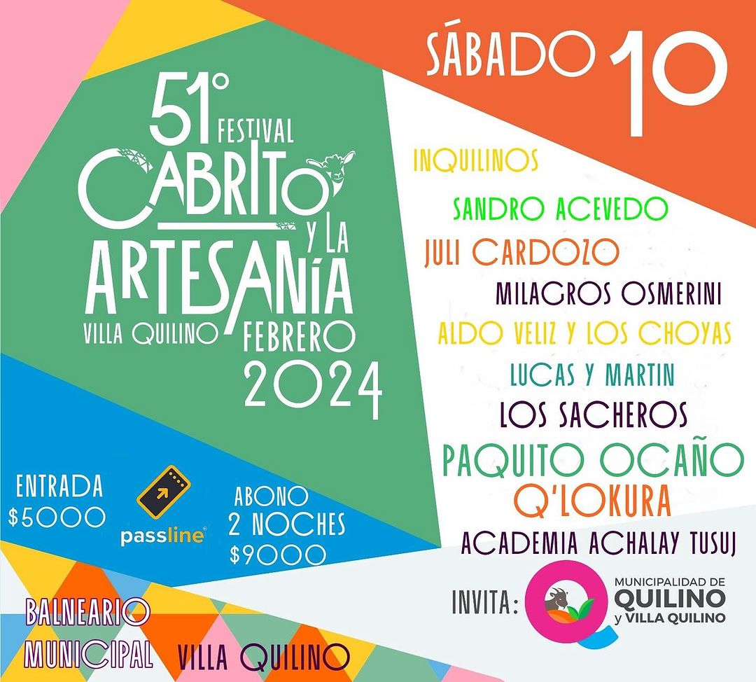 El día de hoy estarán presentes: Inquilinos, Sandro Acevedo, Juli Cardozo, Milagros Osmerini, Aldo Veliz y los choyas, Lucas y Martin, Los Sacheros, Paquito Ocaño, Q´Lokura y la Academia Achalay Tusuj.