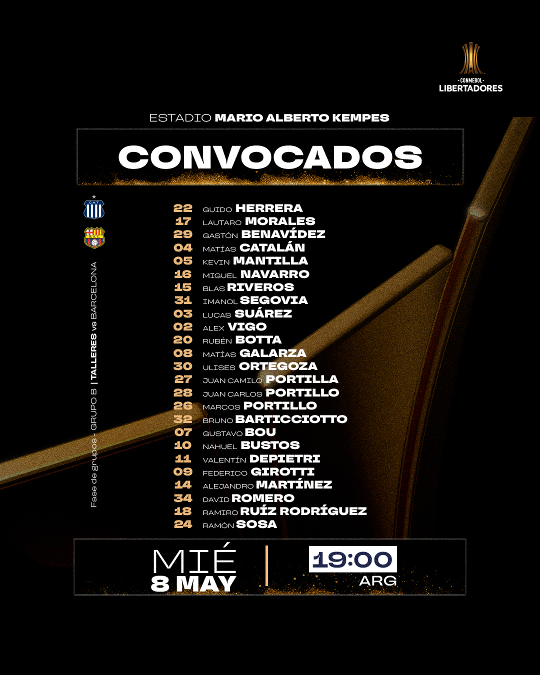 Desde las 19 hs Talleres recibe a Barcelona en el Kempes por la fecha 4 de la Copa Libertadores. El árbitro encargado de impartir justicia será Gustavo Adrián Tejera Capó (Uruguay).