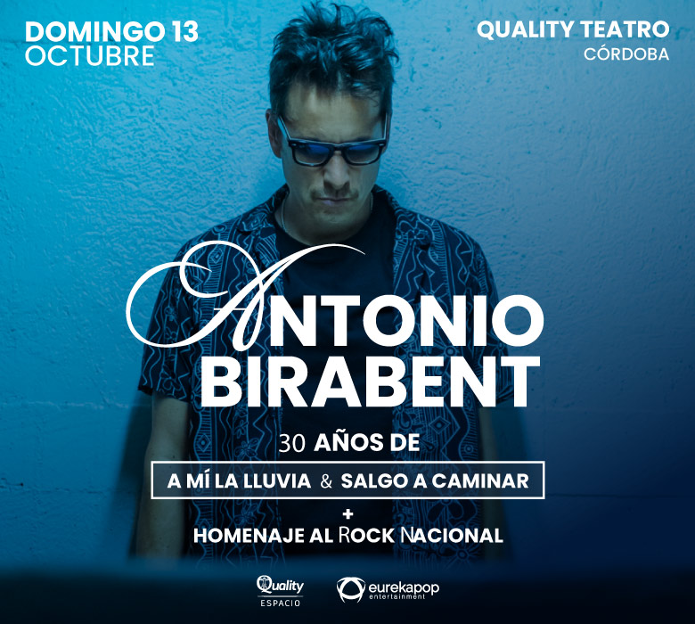 Antonio Birabent llega a Quality para celebrar 30 años de carrera. Birabent, uno de los artistas más versátiles y talentosos de la escena musical y actoral argentina, celebra tres décadas desde el lanzamiento de su primer disco con un relanzamiento de sus grandes éxitos y un tour por Argentina y Uruguay. En Córdoba, se presentará en Quality el 13 de octubre.