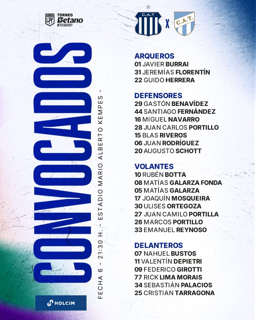 Talleres: Guido Herrera; Gastón Benavídez, Juan Carlos Portillo, Juan Rodríguez y Miguel Navarro; Joaquín Mosqueira o Matías Galarza y Ulises Ortegoza; Rubén Botta o Sebastián Palacios, Emanuel Reynoso o Botta y Blas Riveros; Nahuel Bustos. DT: Alexander Medina.